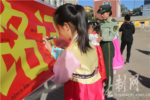 圖為邊防官兵同朝鮮族師生在寫有“銘記九一八,勿忘國恥,振興中華”的橫幅上簽名