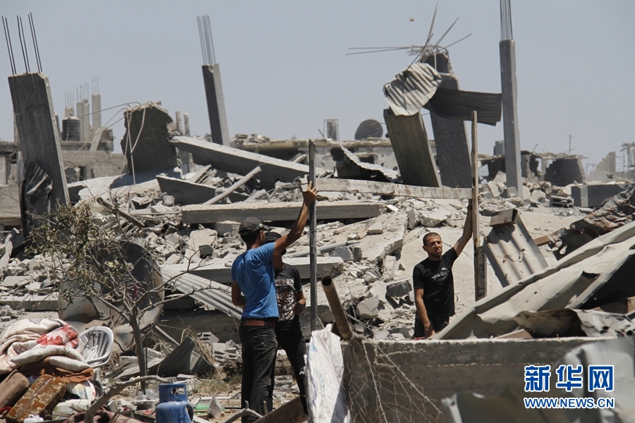 8月7日,幾位巴勒斯坦年輕人正在廢墟上搭架子。據他們説,這處大理石加工廠已經不是第一次被炸了,他們希望能早日復工,否則連吃飯都成問題。新華網記者 劉立偉攝