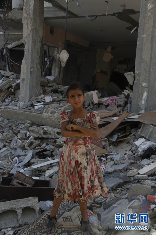 8月7日,一臉困惑的巴勒斯坦女孩,身後是她曾經的家。新華網記者 劉立偉攝