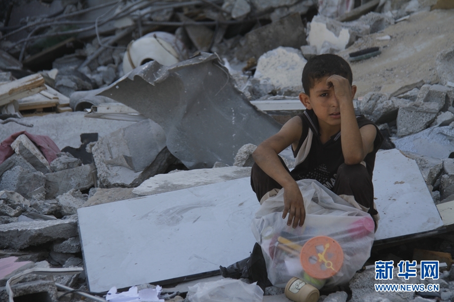8月7日,在廢墟中翻找玩具的男孩,小有收穫。新華網記者 劉立偉攝