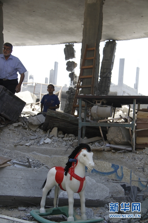 8月6日,巴勒斯坦人正在檢查房屋受損情況。這家人因加沙戰火出逃避難,回家發現房屋被炸毀。新華網記者 劉立偉攝