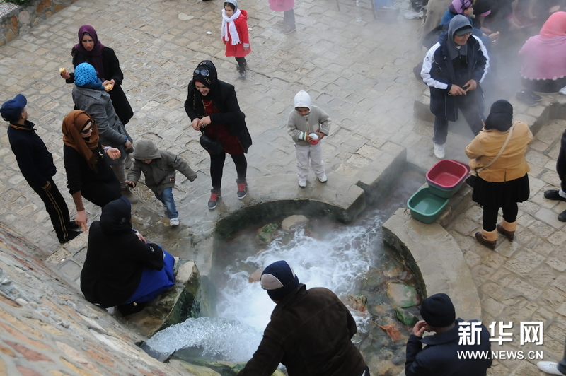 一些突尼斯人在古爾布斯的一眼露天溫泉嬉戲。新華社記者陳斌傑 攝
