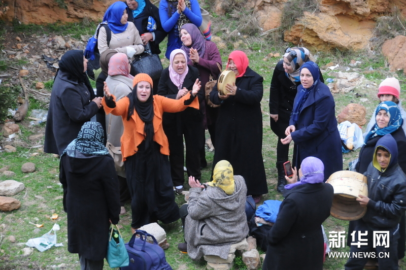 溫泉旁的一處山坡上,一些突尼斯婦女唱歌跳舞,歡度周末。新華社記者陳斌傑 攝