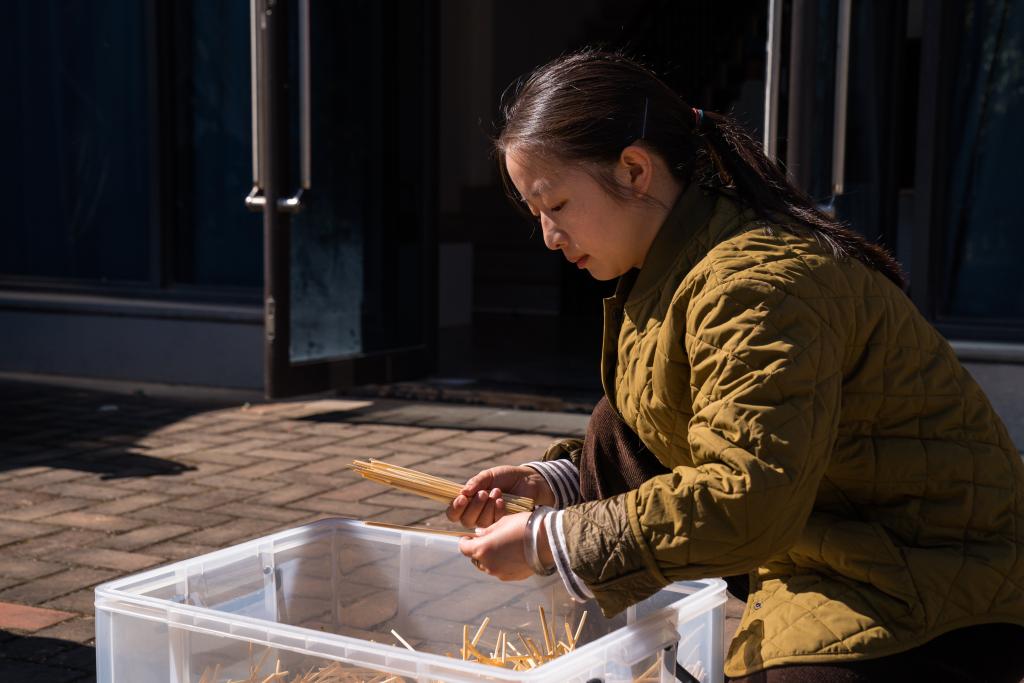 1月25日,楊潔在工作室分類整理原色大麥稈(中)和煮染後的大麥稈。