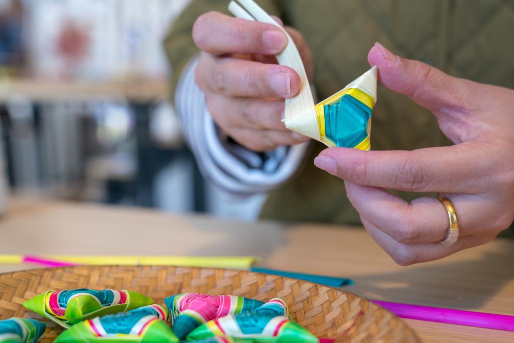 菱角編制技藝是一項擁有悠久歷史和豐富文化內涵的傳統手工技藝,於2013年被列入雲南省第三批省級非物質文化遺産代表性項目名錄。手工藝人通過將大麥稈分揀、煮染,編製成三角形,再用線串接成多種造型,寓意吉祥,深受人們喜愛。