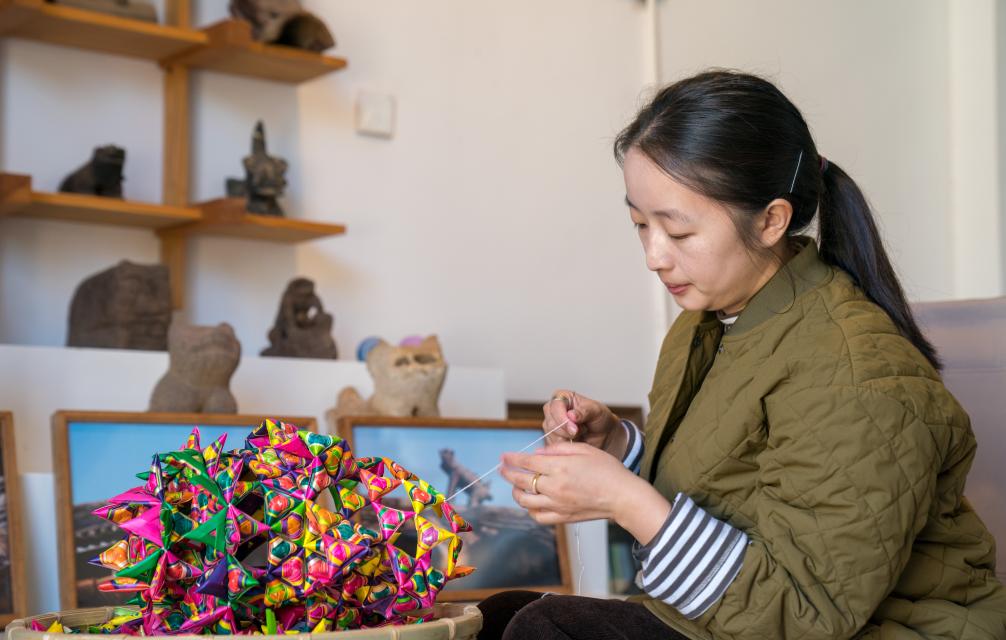 1月25日,楊潔在工作室進行菱角編制。