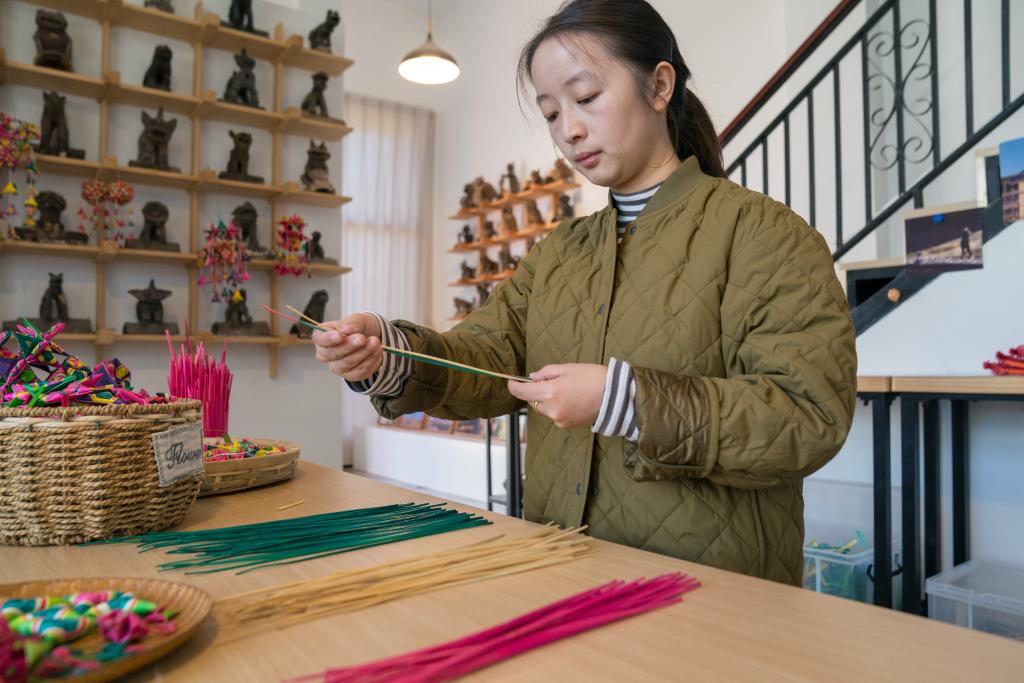 昆明市“90後”菱角編制藝人楊潔從雲南藝術學院畢業後一直從事菱角編制工作。據她介紹,每年春節前夕她會很忙碌。這段時間,她會收到來自各地非遺展會和集市的邀請,也會按照客戶要求定制節慶主題作品。