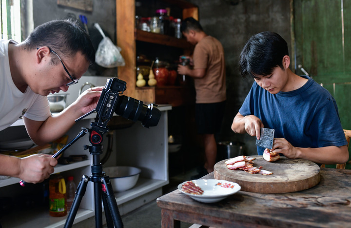 在貴州銅仁陳家寨村,“念鄉人周周團隊”在村裏拍攝短視頻。新華社記者 楊文斌 攝