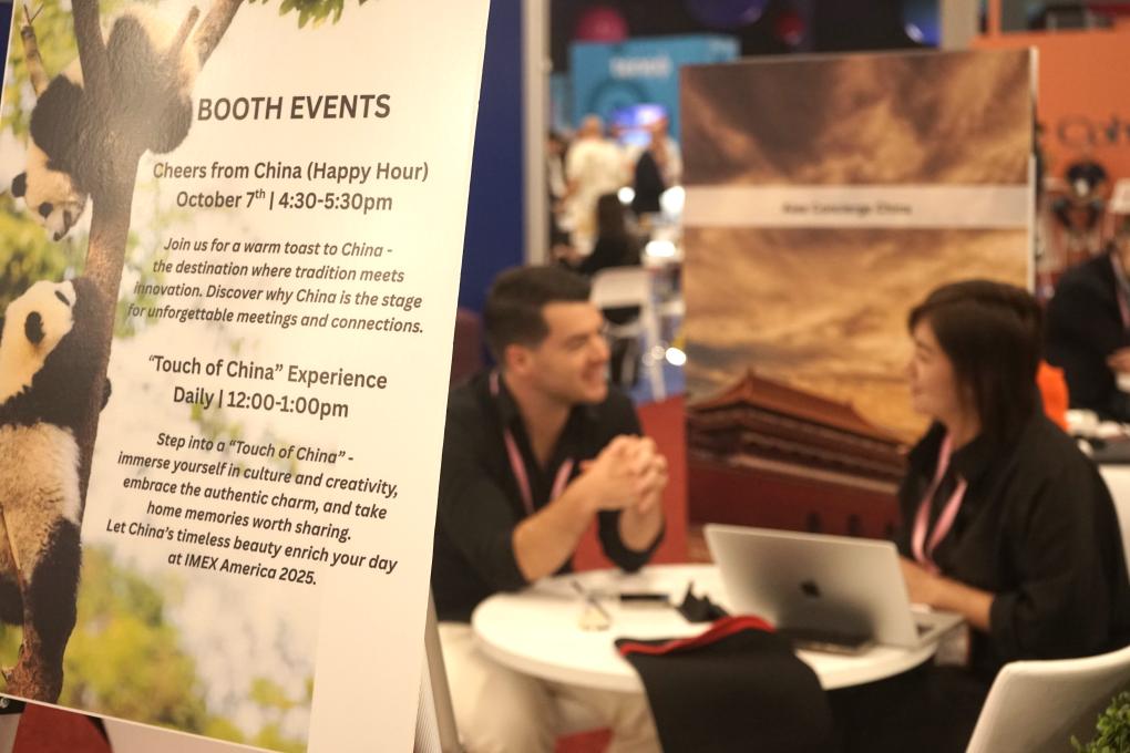 10月8日,在美國拉斯維加斯,人們在2025年美國國際會議與獎勵旅游展的中國展區交談。新華社發(曾慧攝)