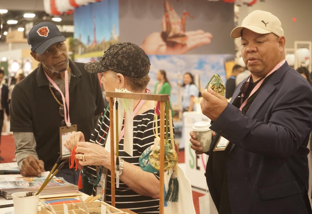 10月8日,在美國拉斯維加斯,參觀者在2025年美國國際會議與獎勵旅游展的中國展區傾聽講解。新華社發(曾慧攝)