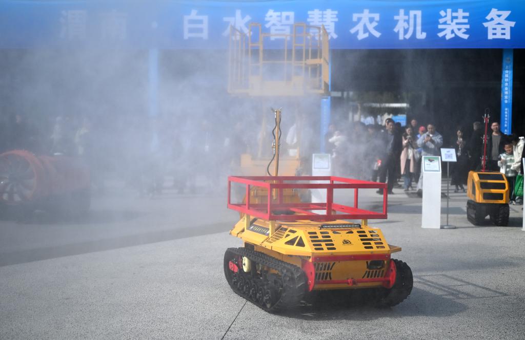 10月26日,渭南君創飛科技有限公司的履帶自走式風送噴霧機在第32屆楊凌農高會向參觀者進行模擬演示。