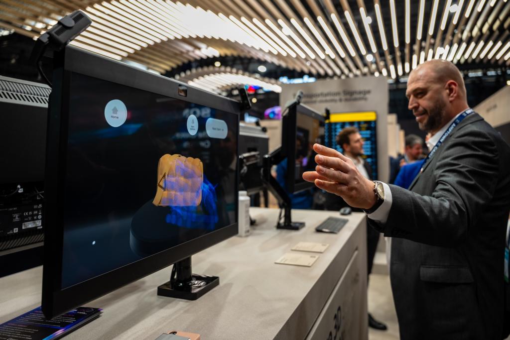 2月3日,在西班牙巴塞羅那,一名男子借助一款屏外傳感器與屏幕交互。