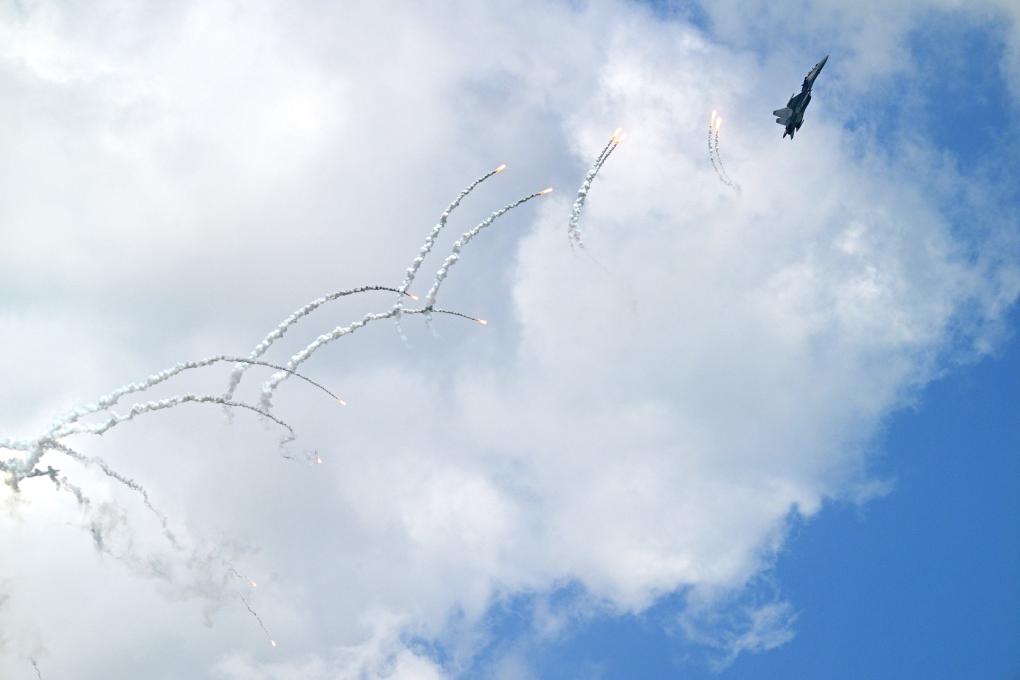 2月3日,一架馬來西亞皇家空軍SU-30MKM戰鬥機在第十屆新加坡航展首日進行飛行表演。