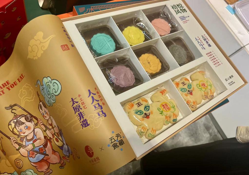 “今年山西古建很熱門,我們的産品融入了多個地標元素,在線上線下都賣得非常好。”作為太原市級非遺“爐食人人馬馬”的第五代傳承人,李璐將太原古縣城、晉祠聖母殿、晉祠鐵人、太原雙塔寺等造型在糕點和月餅上展示,還製作了講述非遺故事的文創禮盒。