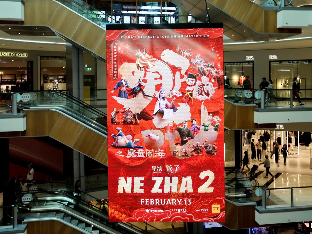 這是2月13日在澳大利亞悉尼一商場拍攝的《哪吒之魔童鬧海》巨幅海報。新華社記者 馬平 攝