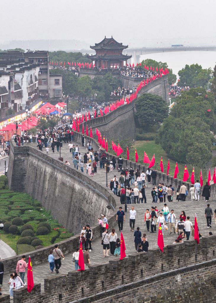 10月4日,游客在湖北省襄陽古城游玩(無人機照片)。新華社發(楊東攝)