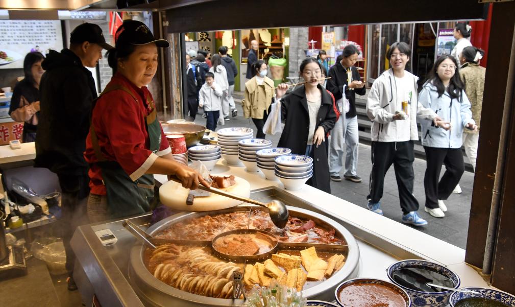 10月6日,游客在北京煙袋斜街品嘗美食。新華社記者 李欣 攝