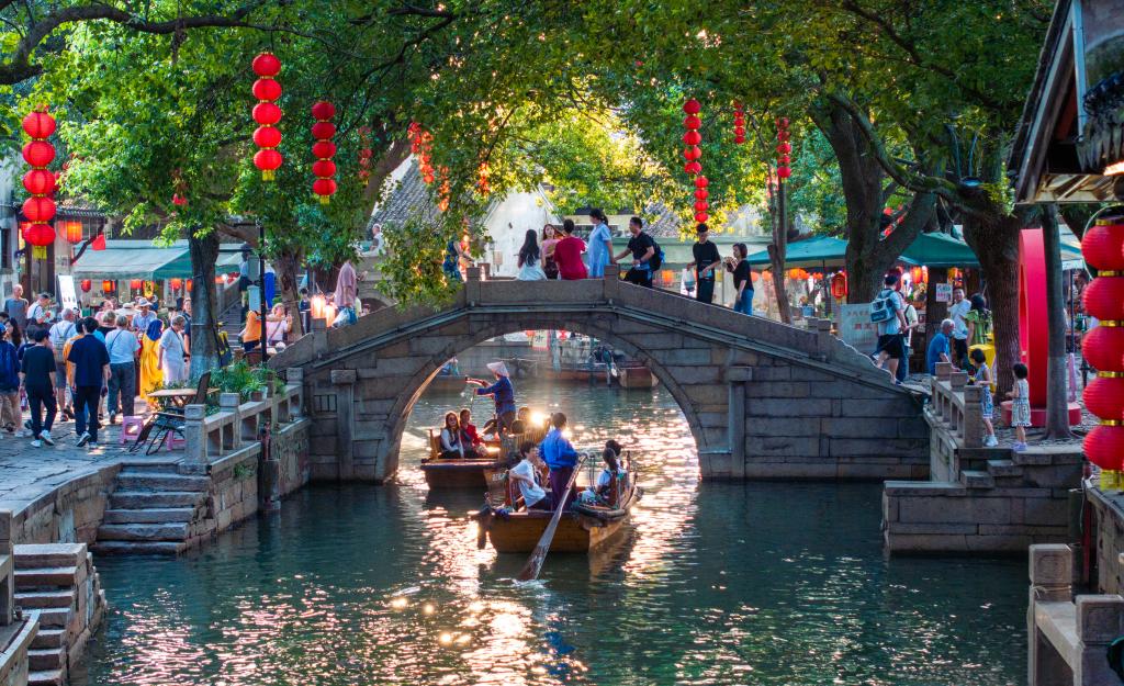 10月6日,游客在江蘇省蘇州市吳江區同裏古鎮游覽(無人機照片)。新華社發(周社根攝)