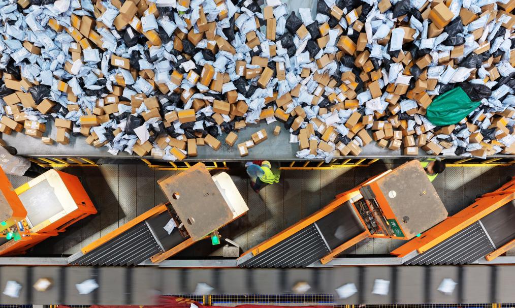 2025年11月10日,在中國郵政集團有限公司江蘇揚州郵件處理中心,工作人員分揀快遞包裹(無人機照片)。新華社發(孟德龍攝)