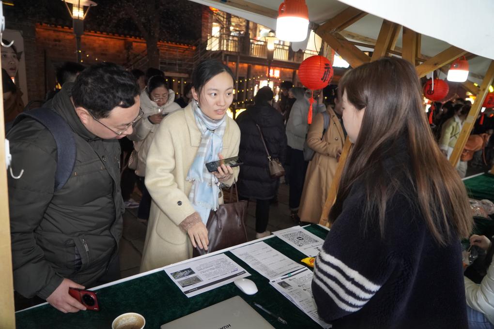 1月9日,南京老門東景區“人才夜市”現場,工作人員向求職者介紹相關政策。(劉臻睿 攝)