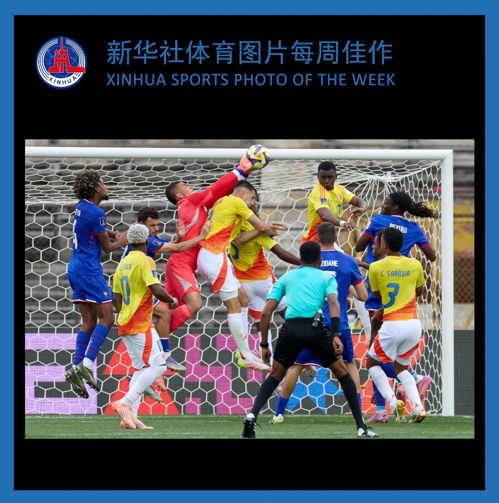 10月18日,哥倫比亞隊門將加西亞(左四)在比賽中撲救。當日,在智利聖地亞哥進行的2025國際足聯U20男足世界盃三四名決賽中,哥倫比亞隊1比0戰勝法國隊,獲得季軍。
