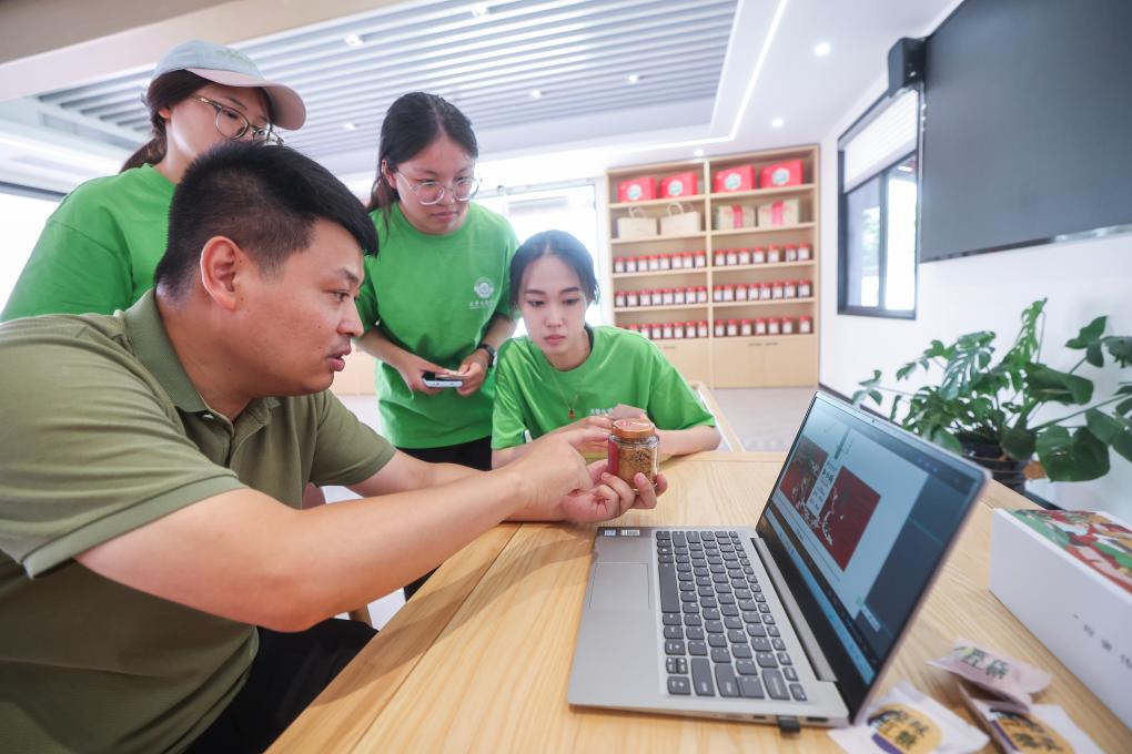 7月15日,在諸暨市安華鎮豐江周村共富工坊內,紹興市文化特派員陳航峰(左一)帶領浙江農林大學暨陽學院設計專業的學生一起探討提升當地紅糖禮盒的包裝設計。2024年陳航峰帶領學生設計了豐江周村共富工坊的第一版紅糖禮盒包裝,這次根據市場的反饋他們繼續提升改進設計包裝。