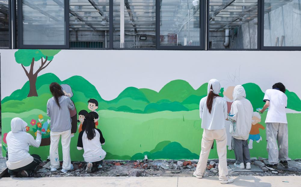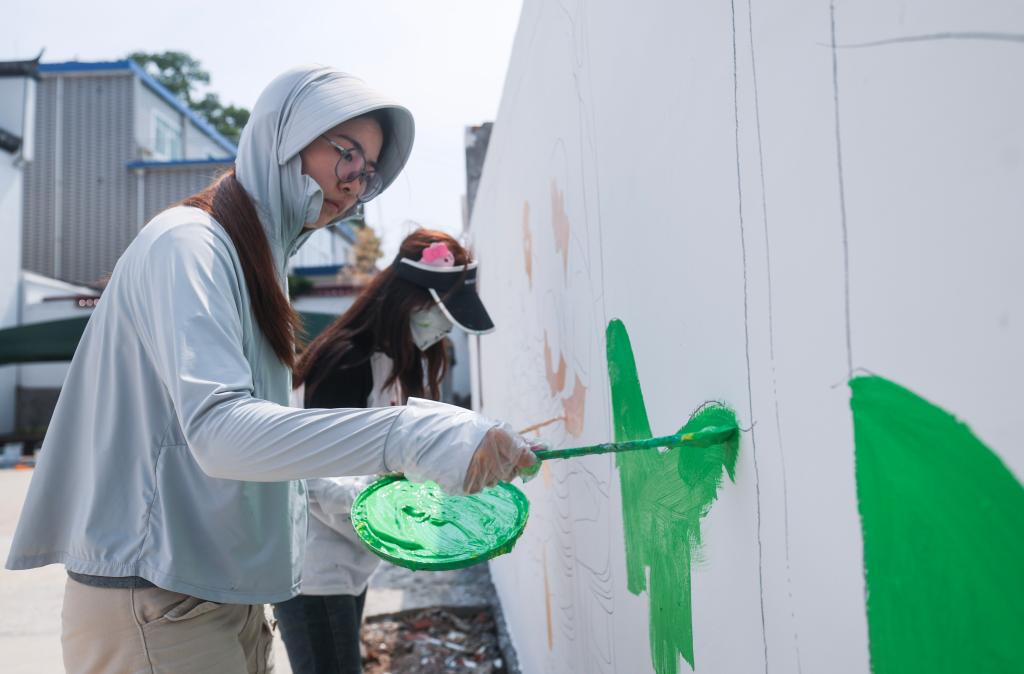 7月15日,在諸暨市安華鎮豐江周村,浙江農林大學暨陽學院設計專業的學生們創作墻繪,美化鄉村人居環境。