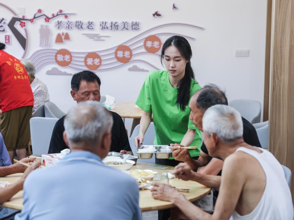 7月15日,在諸暨市安華鎮豐江周村愛心食堂,浙江農林大學暨陽學院的學生開展助餐志願服務。