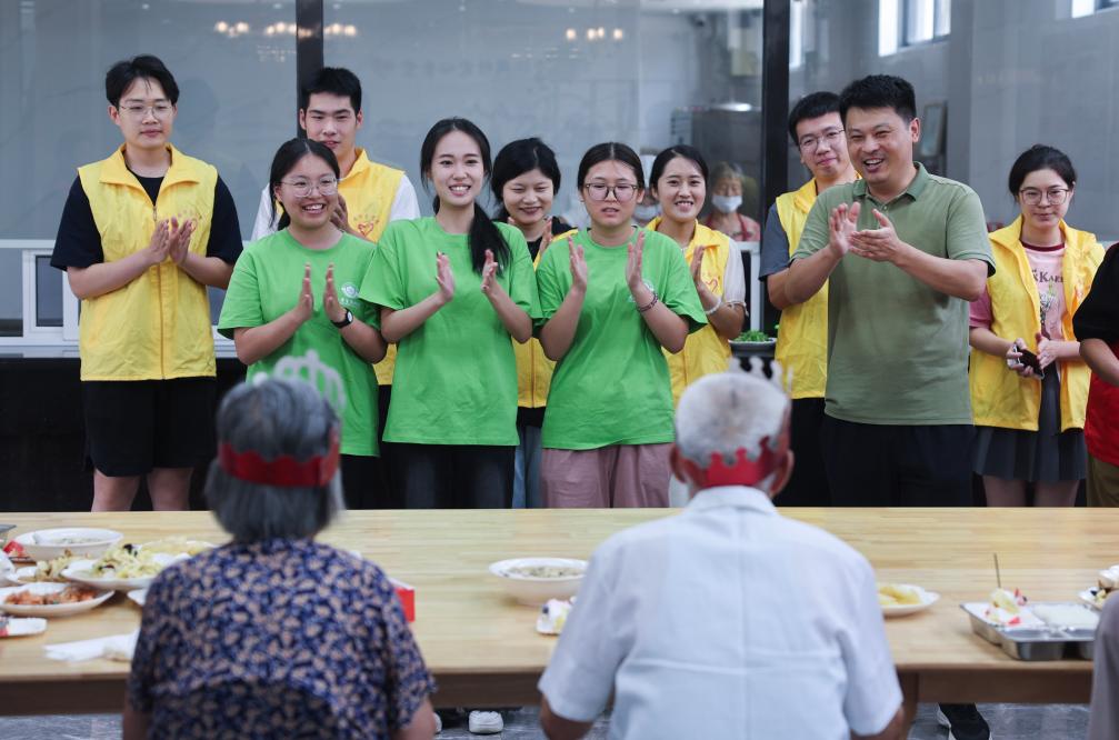 7月15日,在諸暨市安華鎮豐江周村愛心食堂,紹興市文化特派員陳航峰(右二)帶領浙江農林大學暨陽學院的學生們開展志願服務,為過生日的老人唱生日歌。
