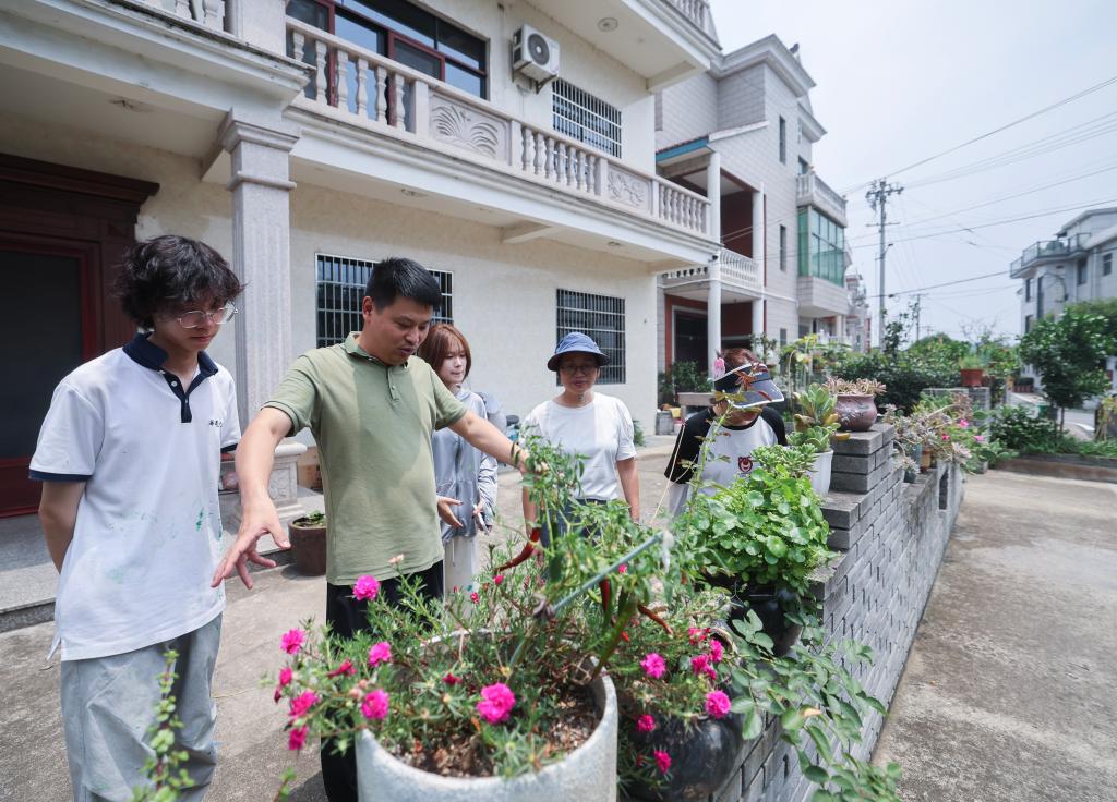 7月15日,在諸暨市安華鎮豐江周村,紹興市文化特派員陳航峰(左二)帶着浙江農林大學暨陽學院的學生們走訪村舍庭院,並提出美麗庭院的設計意見。