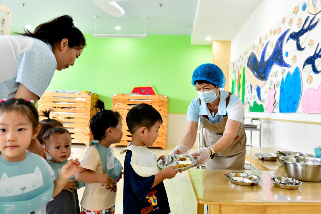 7月22日,在博興縣金色搖籃幼兒園,托育班的孩子在排隊領餐。