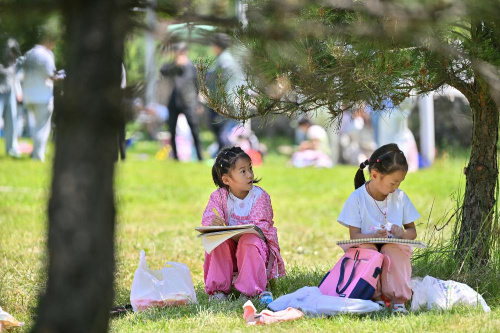 7月22日,兩名小學生在大通縣邊麻溝花海景區內參加暑期美術寫生研學活動。