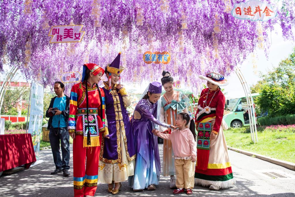 7月22日,在大通縣邊麻溝花海景區,工作人員與一名同家人來游玩的小朋友互動。