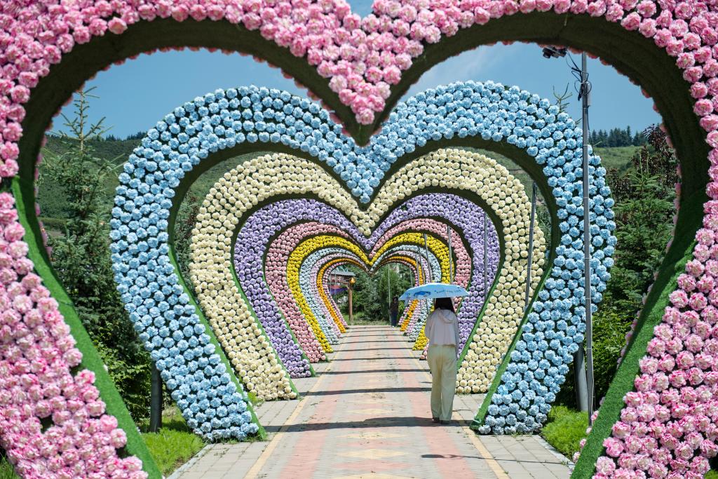 7月22日,在大通縣邊麻溝花海景區,一名游客經過鮮花長廊。
