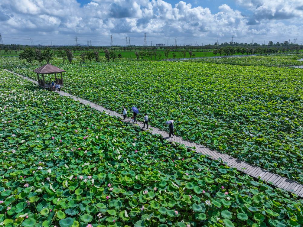 7月23日,游客在海寧市海昌街道雙山村的“武蓮海種”荷花基地賞荷(無人機照片)。