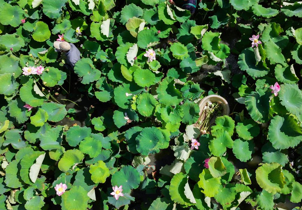 7月23日,種植戶在海寧市海昌街道雙山村的“武蓮海種”荷花基地采收荷花和蓮蓬(無人機照片)。