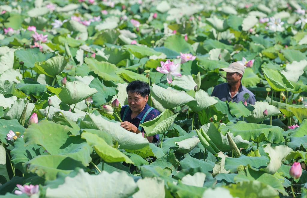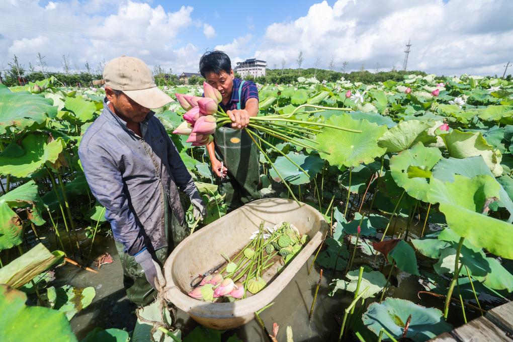 7月23日,種植戶在海寧市海昌街道雙山村的“武蓮海種”荷花基地采收荷花和蓮蓬。