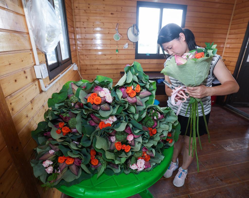 7月23日,工作人員在海寧市海昌街道雙山村的“武蓮海種”荷花基地用荷花、蓮蓬荷葉等製作花束。