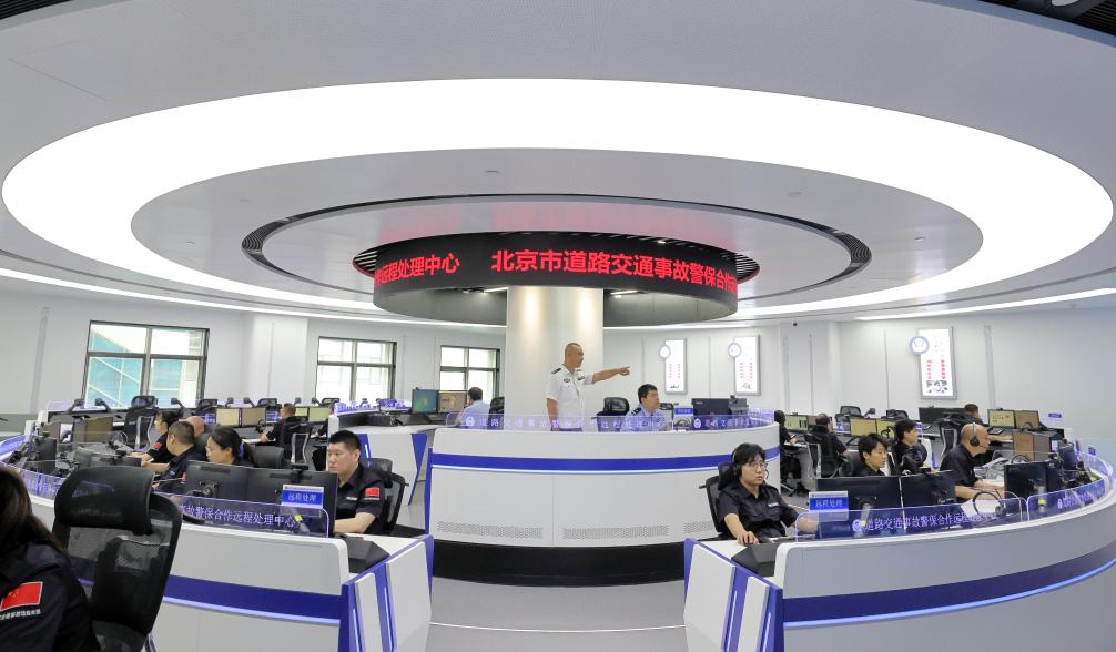 2025年5月23日,在北京市公安局交管局北京道路交通事故警保合作遠程處理中心,事故處理支隊支隊長於海濤(中)和民警在統籌調度全市輕微交通事故警情遠程處置工作。新華社記者 殷剛 攝