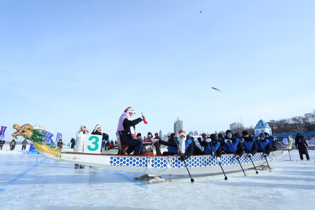 冰封的哈爾濱松花江上,一聲聲激昂的加油吶喊聲響起。