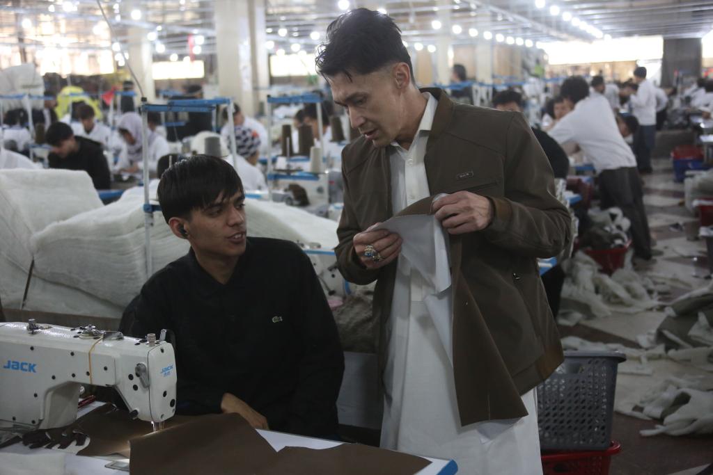 12月4日,在阿富汗首都喀布爾,“麥克斯”服裝工廠負責人扎克裏亞·薩迪克·莫拉迪(右)和員工交流。