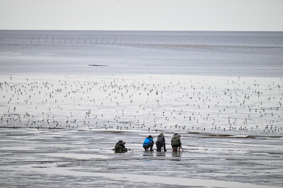 8月25日,攝影愛好者在東&條子泥濕地拍鳥。新華社記者 季春鵬 攝