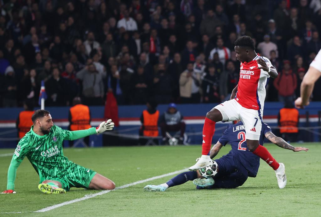 5月7日,阿森納隊球員薩卡(上)在比賽中射門得分。當日,在法國巴黎舉行的2024-2025賽季歐洲足球冠軍聯賽半決賽次回合比賽中,法甲巴黎聖日耳曼隊主場2比1戰勝英超阿森納隊,以兩回合3比1的總比分晉級決賽。新華社記者 高靜 攝
