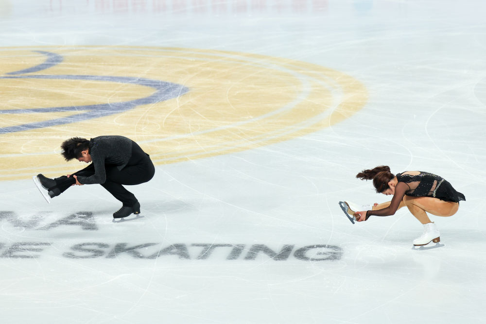 坐在她身邊的是老搭檔韓聰。這對闊別賽場許久的中國雙人滑組合在2022年北京冬奧會後首度攜手出現在花滑賽場上。這次亮相,距離他們奪得冬奧金牌已經過了三年零八個月。