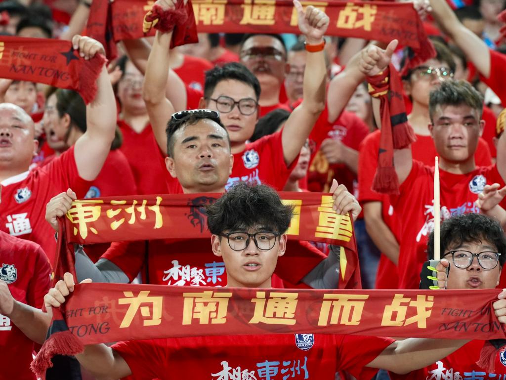 6月29日,球迷在場邊為南通隊加油。新華社發