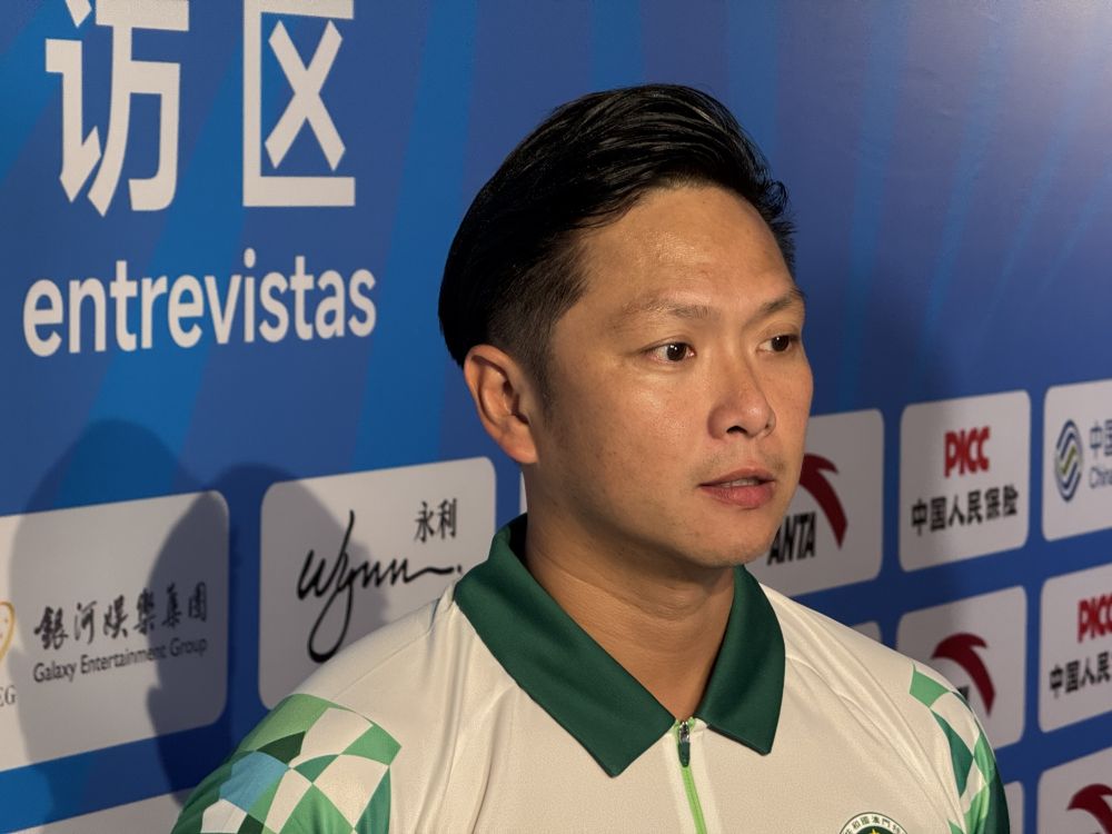 11月10日,澳門隊主教練張嘉俊賽後接受採訪。新華社記者 胡佳麗 攝