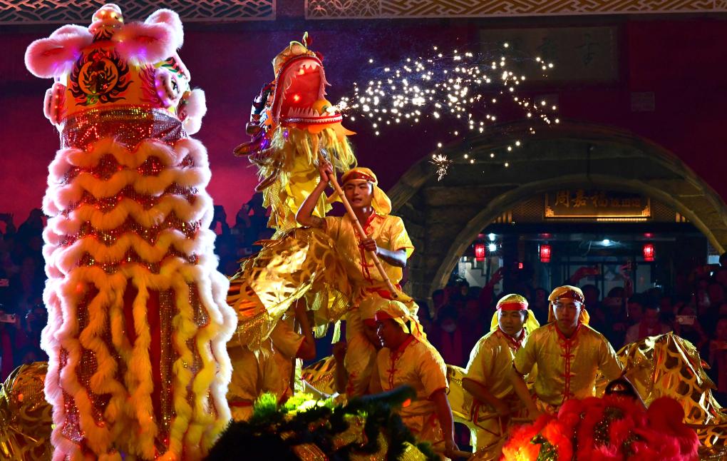 2025年2月6日,人們在雲南省大理白族自治州南澗縣龍燈會上表演舞獅。新華社記者 陳欣波 攝