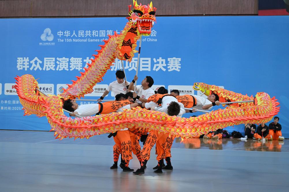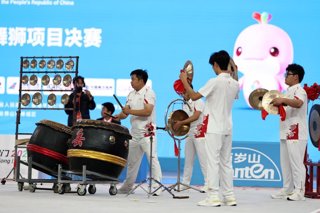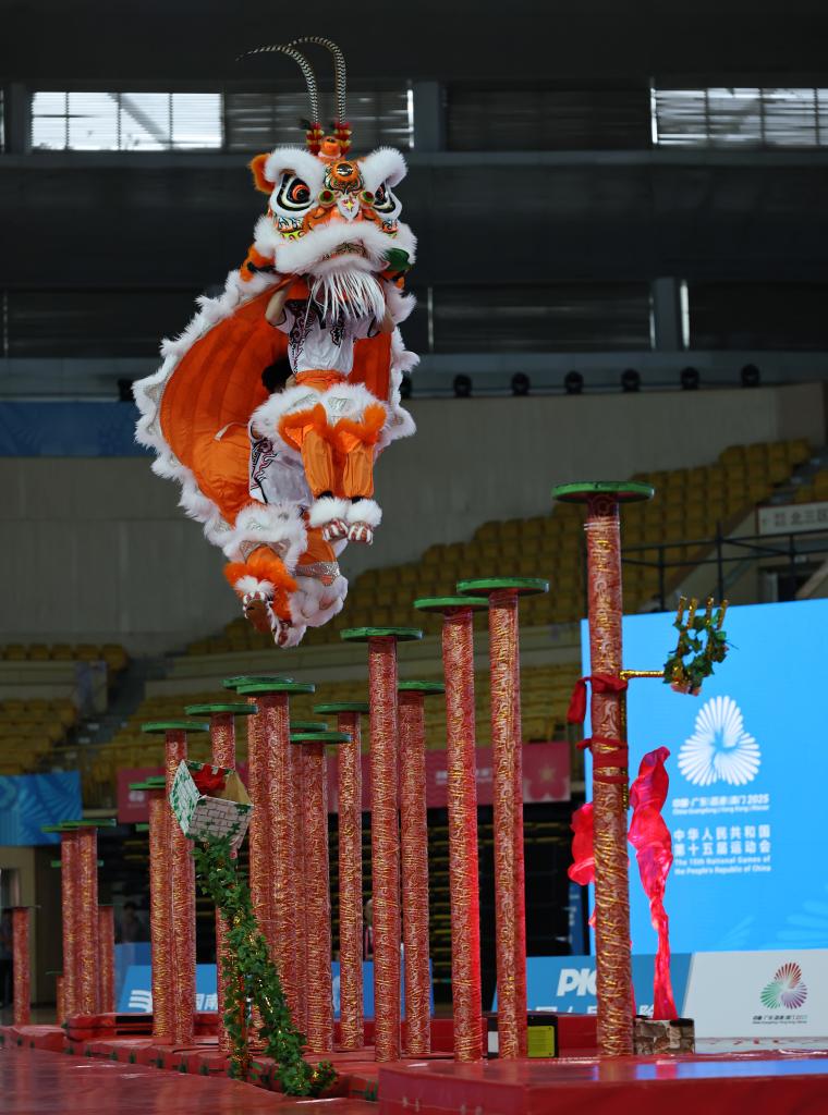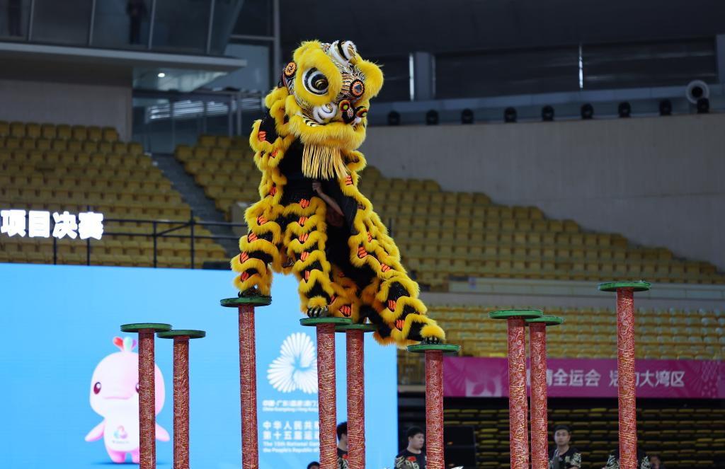 2025年11月11日,粵港澳隊在第十五屆全運會群眾展演舞龍舞獅項目南獅自選決賽比賽中。新華社記者 王鵬 攝