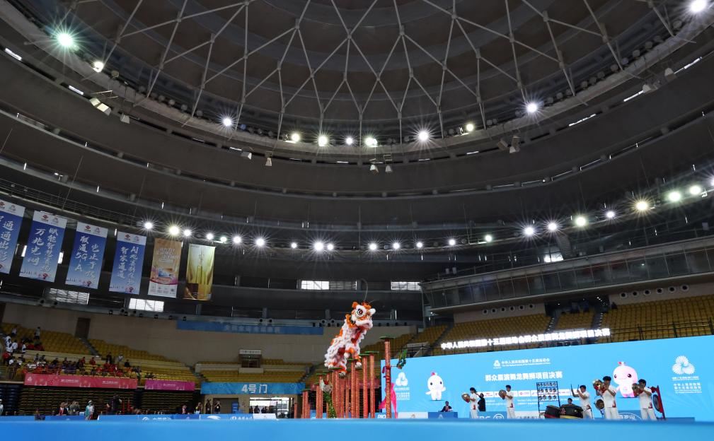 2025年11月11日,河南隊在第十五屆全運會群眾展演舞龍舞獅項目南獅自選決賽比賽中。新華社記者 王鵬 攝