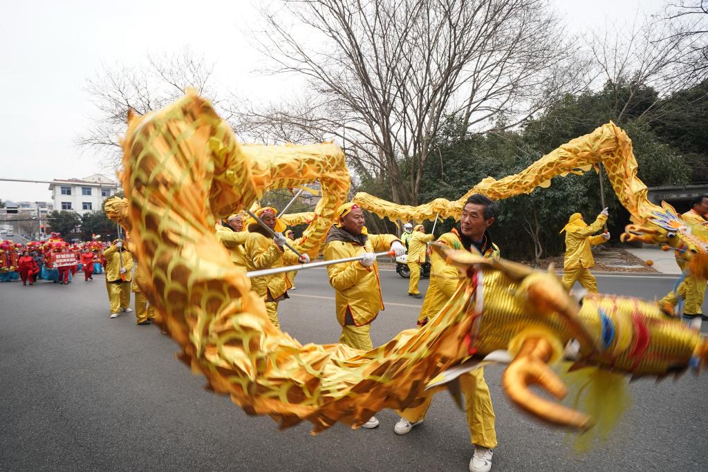 2025年2月11日,巡游隊伍在江蘇省盱眙縣城市道路上舞龍。新華社記者 季春鵬 攝